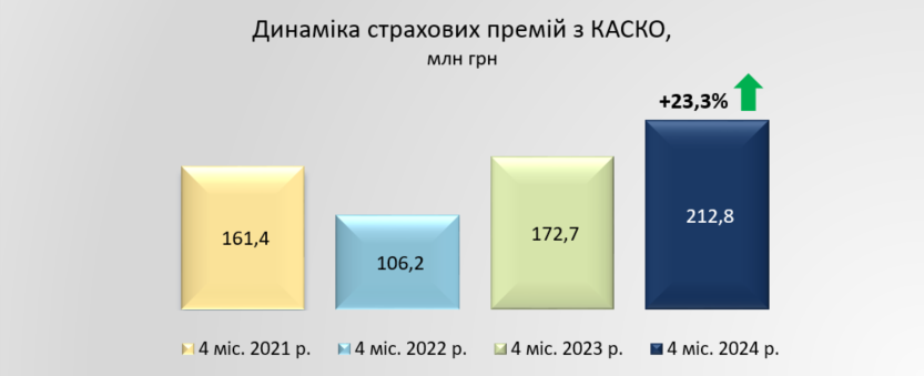 У квітні 2024 року Компанія залучила 76,8 млн грн премій, що на 63,8% більше, ніж у квітні минулого року. В тому числі, премії з КАСКО становили 61,1 млн грн (+47,1%), з ОСЦПВ – 13,7 млн грн (+289,6%).